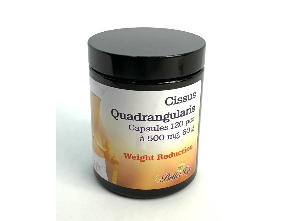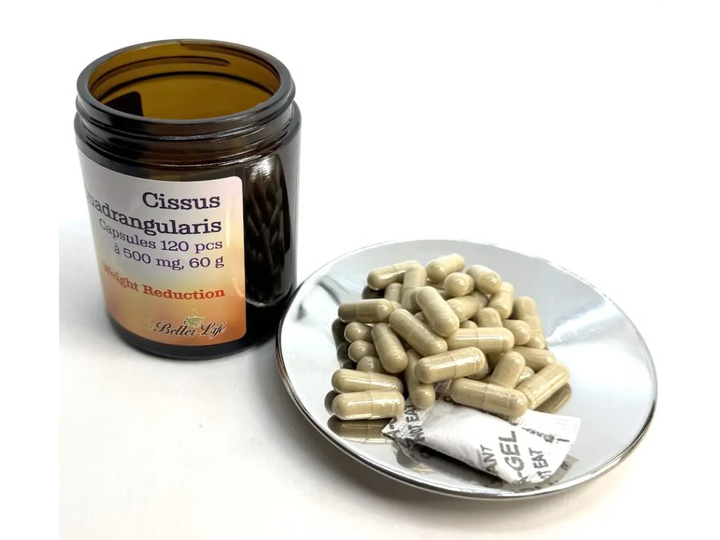 Opakowanie 60000 mg / 120 kapsułek po 500 mg (kapsułki są przezroczyste), ciemna szklana butelka. Zawiera wyłącznie zioło cissus quadrangularis. Dawka na min. 60 dni.