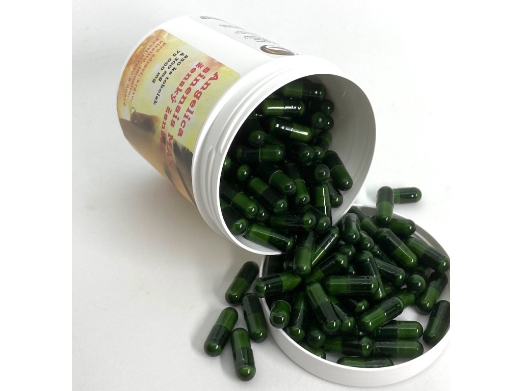 Drobno zmielone zioło, porcjowane w wegańskich prebiotycznych kapsułkach HPMC, barwione chlorofilem, 72 000 mg / 240 kapsułek / 300 mg na kapsułkę