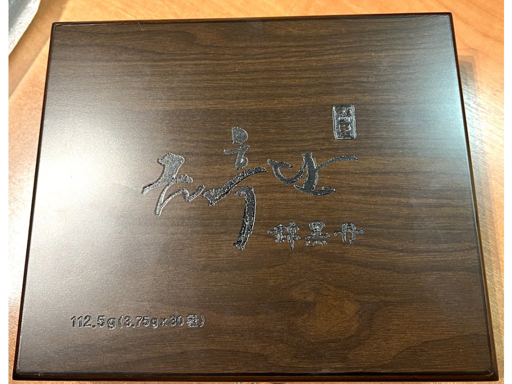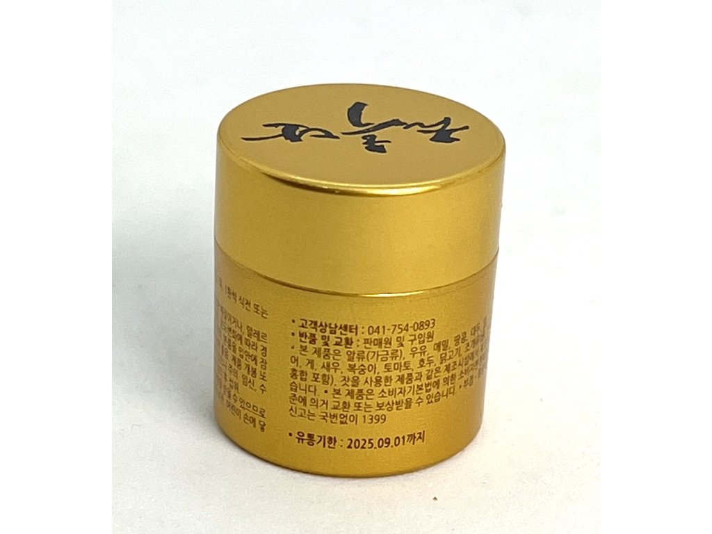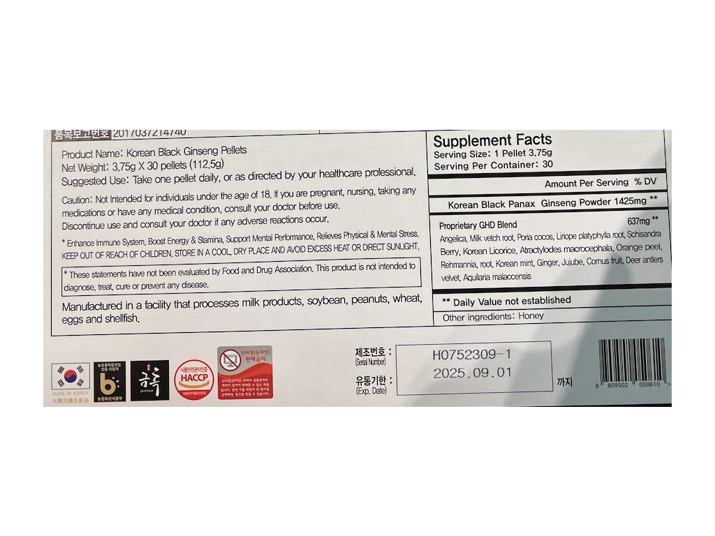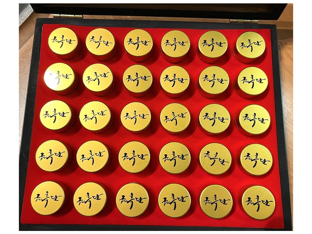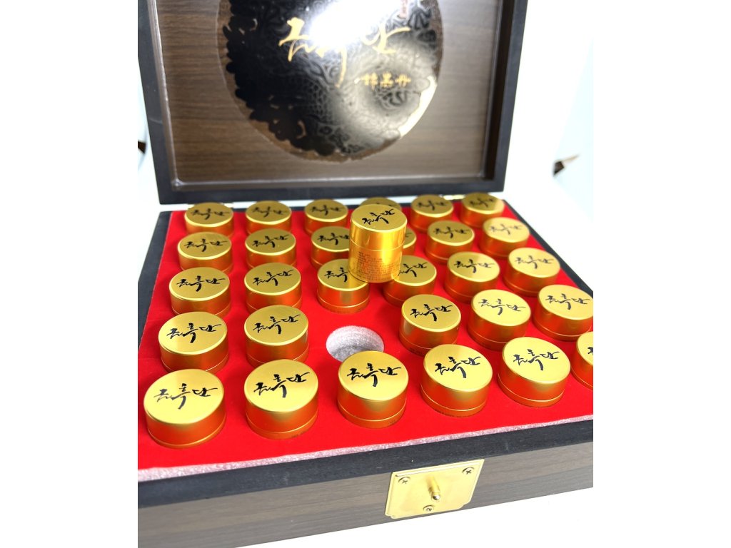 Koreański czarny (bardzo silny) żeń-szeń, miód i mieszanka 13 ekstraktów ziołowych, np. arcydzięgiel chiński (odporność, przeciw uderzeniom gorąca, poceniu się), korzeń astragalus (wzmocnienie odporności), lukrecja, skórka mandarynki ekologicznej, morwa, laktobacillus z kimchi, imbir, chińskie daktyle, derenia, poroże jelenia – proszek (hodowla ekologiczna z Nowej Zelandii, naturalnie zrzucone poroże), 30 buteleczek po 3,75 g, opakowanie prezentowe, certyfikat jakości .