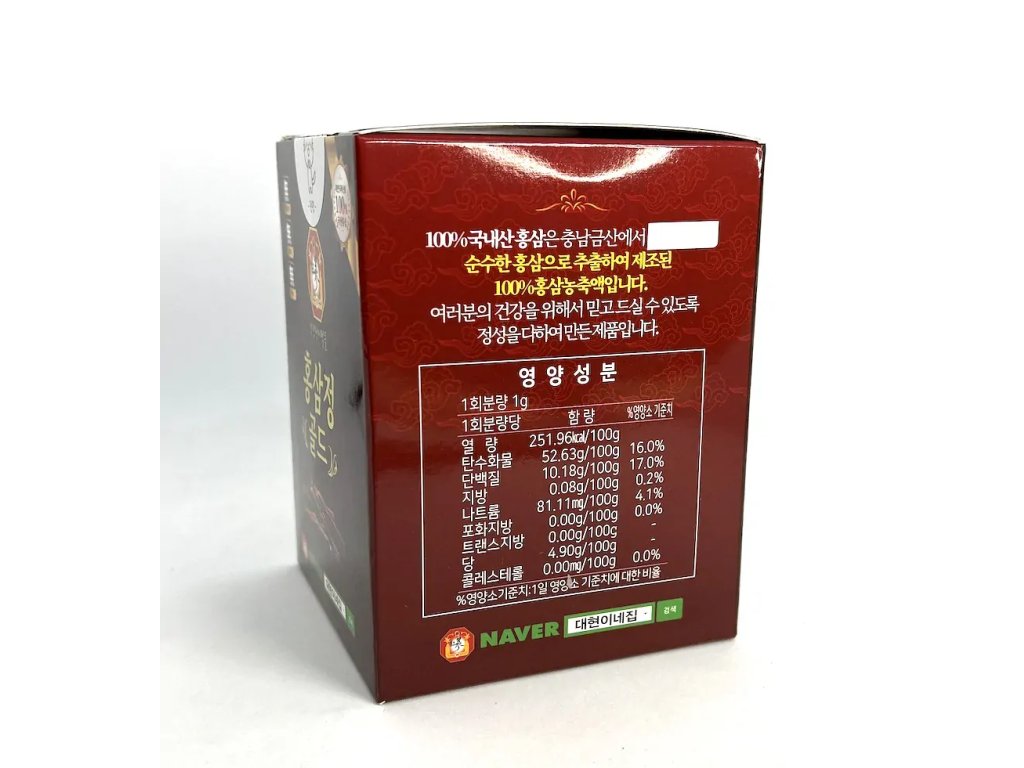 Červená barva korejského ženšene je pro znalce důkazem nejnáročnější a nejkvalitnější formy zpracování. Kořen je opakovaně napařován a následně sušen. Celý proces zpracování trvá i déle než rok a jeho výsledkem je extrakt, který obsahuje výtažky ze všech částí kořene. Červený Korejský ženšen je lépe stravitelný a je tělem lépe absorbován, má vyšší efekt a eliminuje případné nežádoucí účinky, které mohou způsobovat jiné formy ženšenu. Formou zpracování se výrazně zvyšuje jeho trvanlivost (více jak 10 let - u sušených kořenů). Je vhodný i pro osoby pod 35 let věku, ne však mladší 18 let a maximální doporučená denní dávka jsou 2 gramy = 2 000 mg účinné látky.