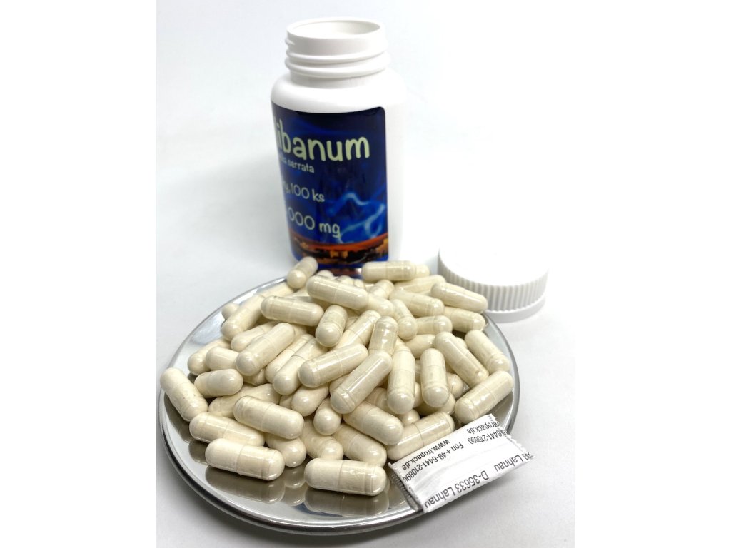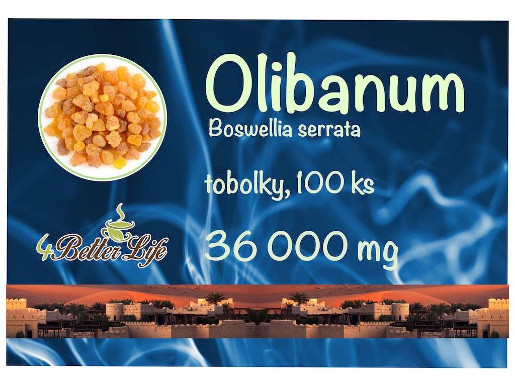 V plastové dóze je 100 ks HPMC tobolek (HPMC = přírodní vláknina na bázi celulózy, tj. bez želatiny, vhodné i pro vegany) každá naplněna 360 mg jemně mleté pryskyřice stromu Boswellia serrata. Tato pryskyřice obsahuje přes 50% látek, které se souhrně nazývají kyselina boswelliová.