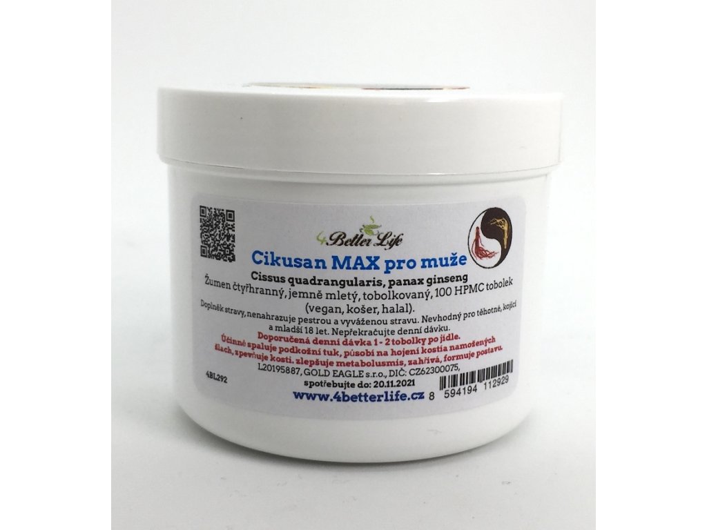 Skuteczny spalacz tłuszczu, przyspiesza metabolizm tłuszczów i odżywia kości oraz ścięgna. Również dla osób trenujących rekreacyjnie lub intensywnie. Wysokie dawki cissusu i żeń-szenia pozwalają tym osobom lepiej znosić obciążenia treningowe, mieć większą wytrzymałość, wzmocnić kości i ścięgna, a jednocześnie wymodelować sylwetkę, pozbyć się zmęczenia, poprawić libido i wzmocnić odporność. Opakowanie zawiera 45000 mg / 100 kapsułek HPMC wegańskich (prebiotycznych) po 450 mg (225 mg cissus, 225 mg żeń-szenia, kapsułki HPMC „00” przezroczyste lub zielone). Alternatywne opakowanie: butelka na lek z zamknięciem zabezpieczającym.