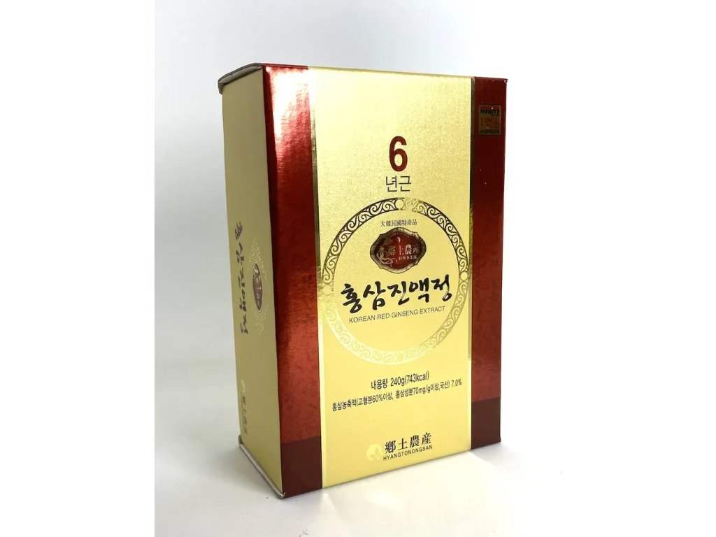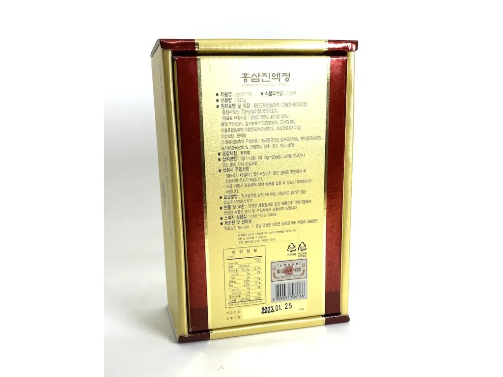 Zestaw upominkowy zawierający wysokiej jakości ekstrakt z koreańskiego żeń-szenia, 6-letniego, w szklanej buteleczce z miarką (w pudełku wewnątrz opakowania), 240 gramów. Ekstrakt jest wytwarzany w około 60% z głównego korzenia i w około 40% z drobnych korzeni końcowych i innych ziół, dzięki czemu uzyskuje się szerokie spektrum substancji czynnych.