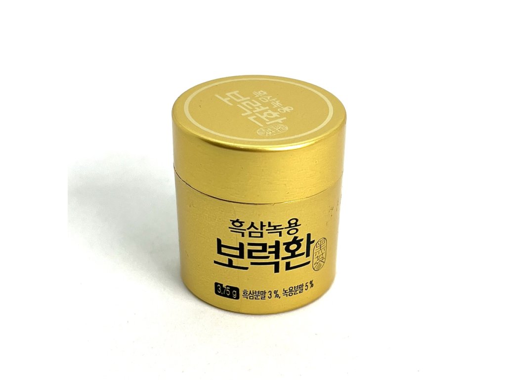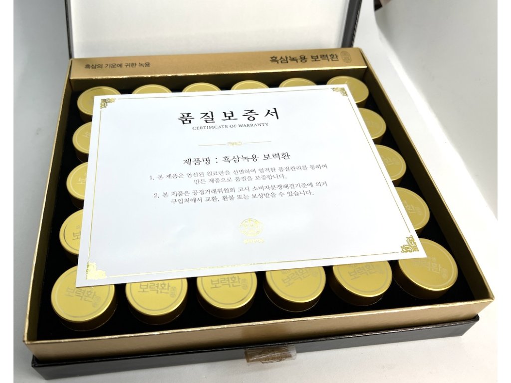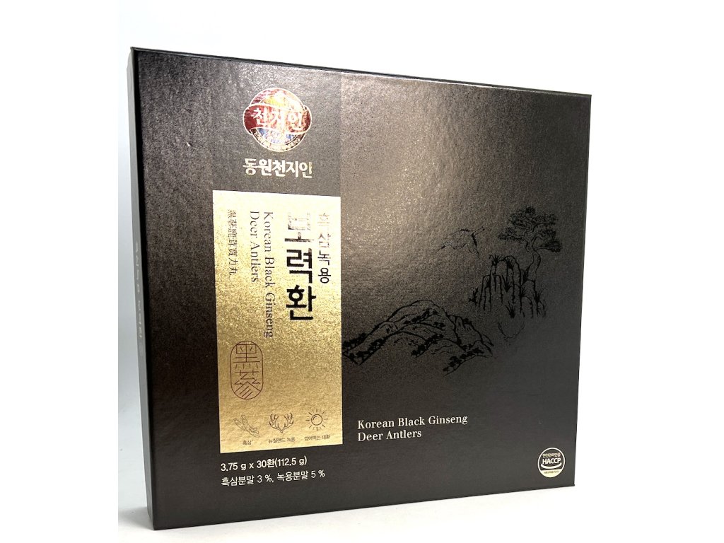 Koreański czarny (bardzo silny) żeń-szeń, miód i dodatek 13 ekstraktów ziołowych, np. arcydzięgiel chiński (odporność, przeciw uderzeniom gorąca, poceniu się), korzeń astragalus (wzmocnienie odporności), lukrecja, skórka mandarynki ekologicznej, morwa, laktobacillus z kimchi, imbir, chińskie daktyle, derenia, poroże jelenia – proszek (ekologiczna hodowla z Nowej Zelandii, naturalnie zrzucone poroże), 30 buteleczek po 3,75 g, opakowanie prezentowe, certyfikat jakości .