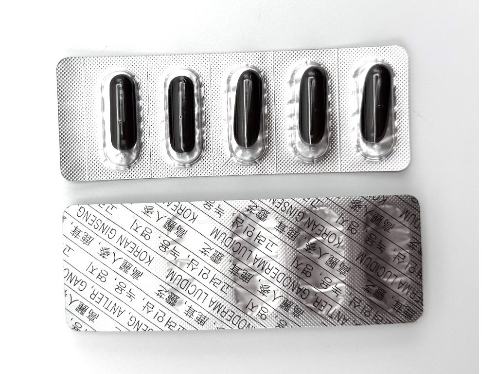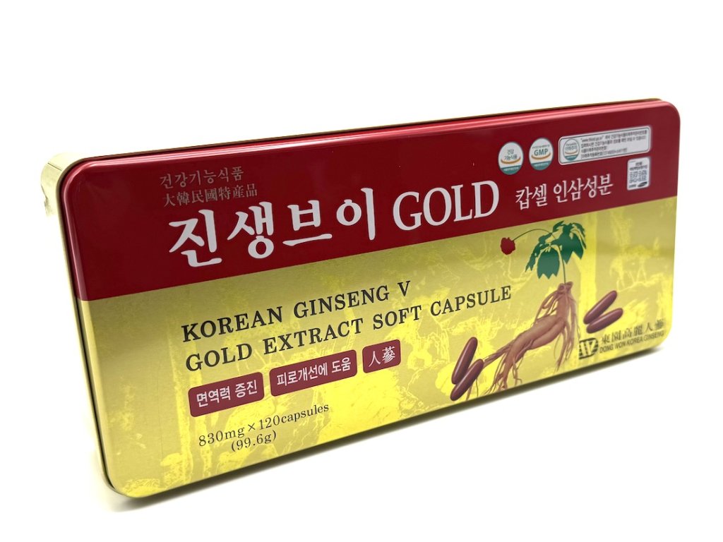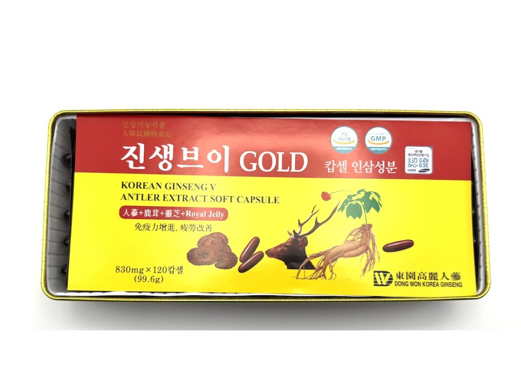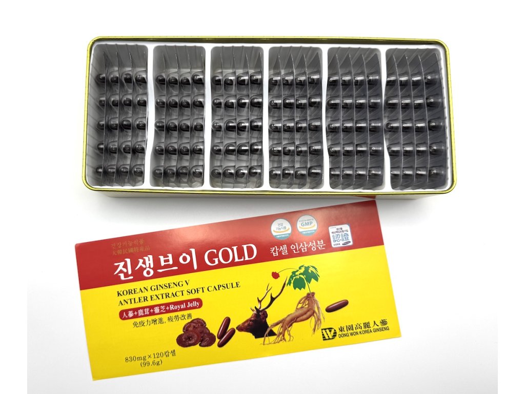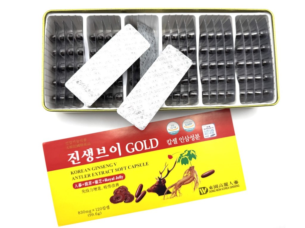 Prawdziwy koreański żeń-szeń – ekstrakt w miękkich kapsułkach (łatwych do połknięcia) w jakości GOLD, 120 kapsułek wypełnionych ekstraktem żeń-szenia, reishi i ekstraktem poroża jelenia, w jednej kapsułce 830 mg, pakowane w blaszane pudełko, w blistrach.
