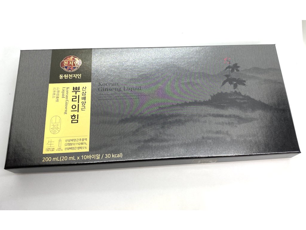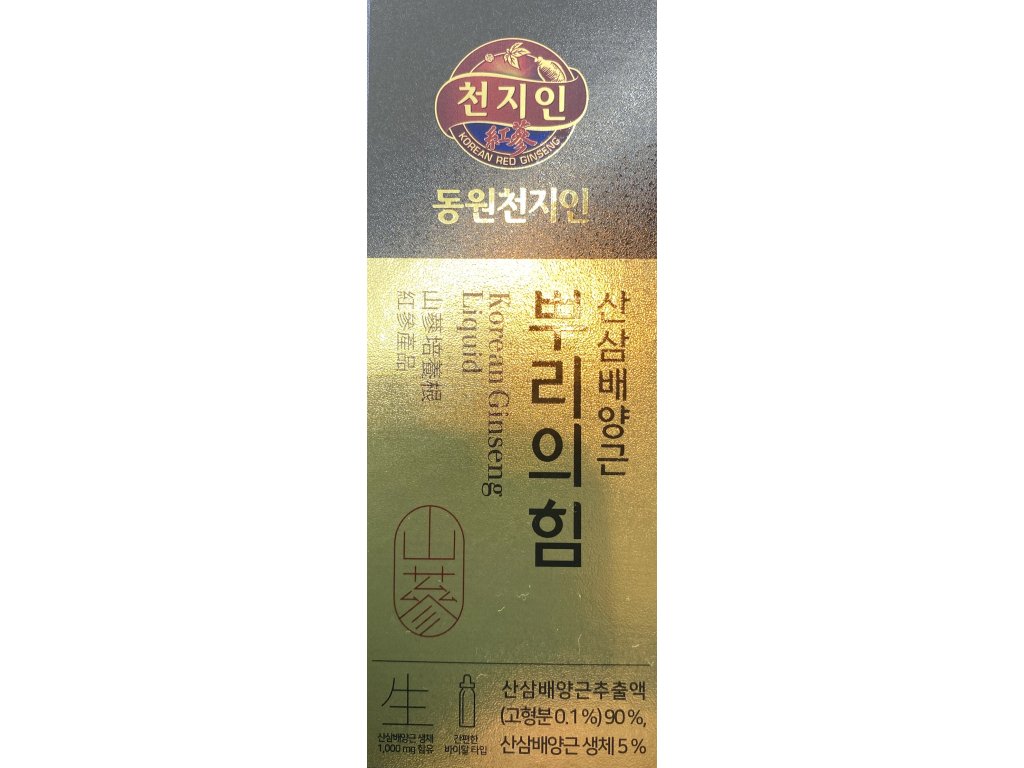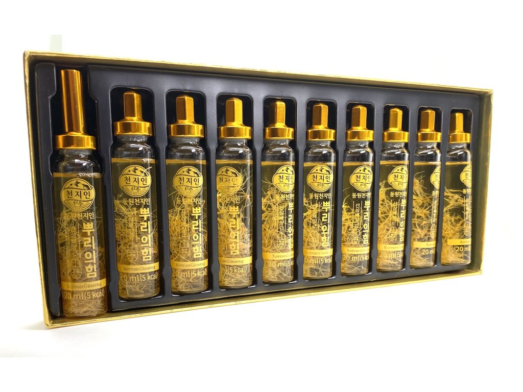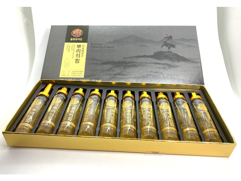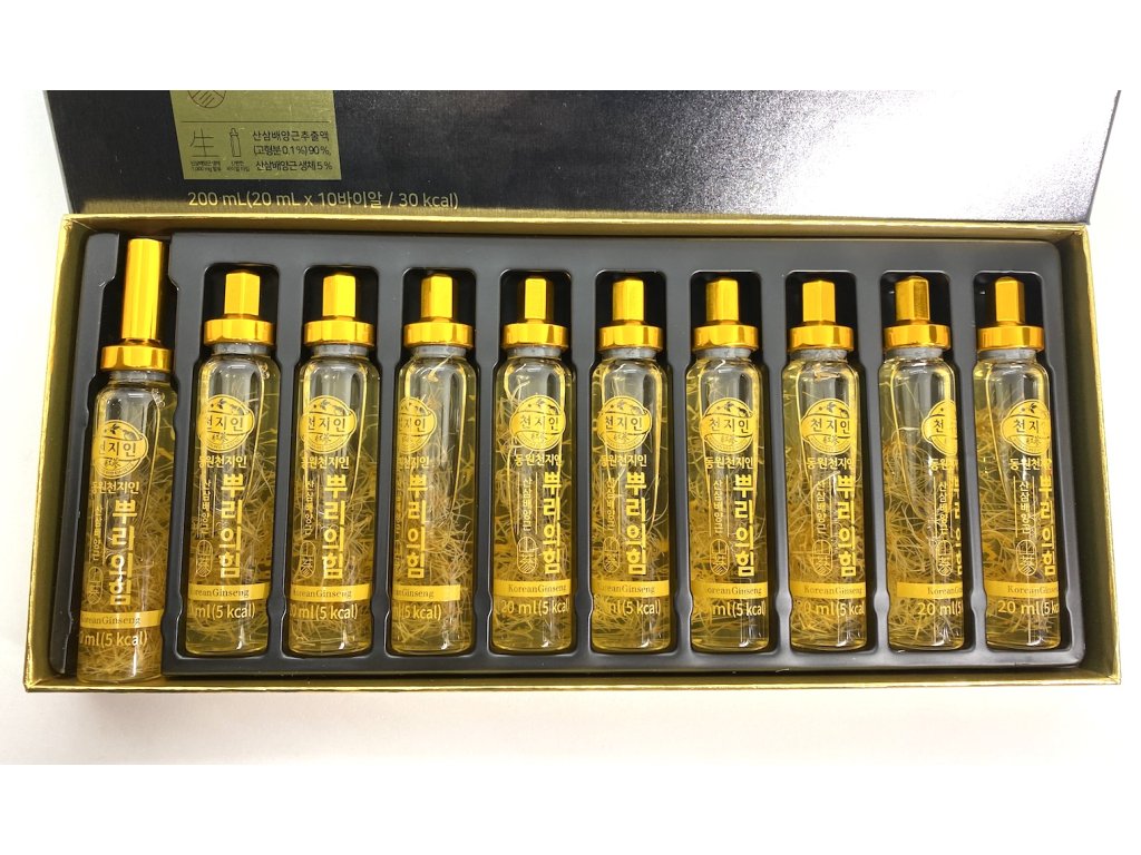 Wyciąg z dzikiego żeń-szenia koreańskiego (górskiego), 30 butelek po 20 ml, zapakowane w opakowanie prezentowe, napar bezalkoholowy, z dodatkiem reishi i czerwonego żeń-szenia. Zawiera łącznie 30 kcal, 15 mg sodu, 8 g węglowodanów, 4 g cukru. Ginsenoside 70 mg/g.