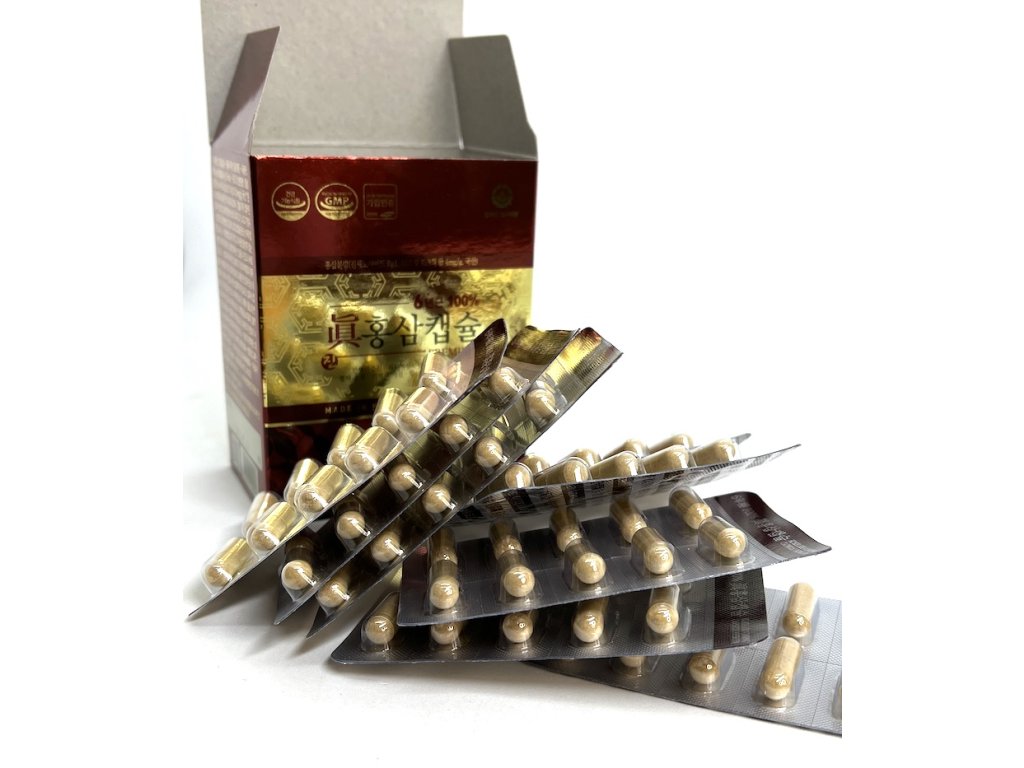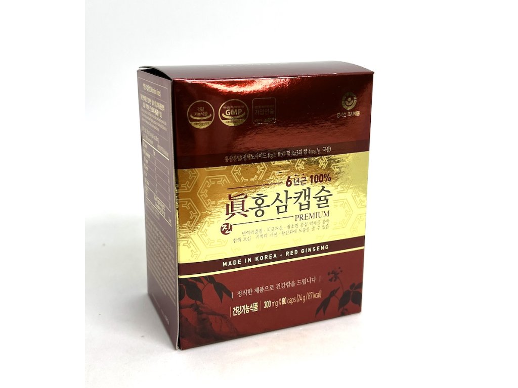 Pravý korejský ženšen, jemně mletý, 80 tobolek plněných pouze ženšenem, v jedné tobolce 300 mg, baleno v ozdobné krabičce, blistrováno po 10 ks na jednom blistru, na 100 g výrobku 0 kcal, 0 cukru, 0 bílkovin, 0 tuku. Celkem 24 g účinné látky - ženšene. V denní dávce pak je 300 - 600 mg účinné látky - ženšenu.